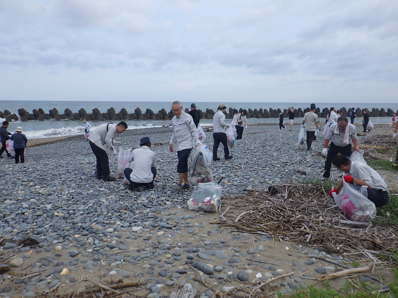 毎年開催される『クリーンビーチいしかわ』の清掃活動に参加し、当社がJVとして運転管理を実施している加賀沿岸流域下水道翠ヶ丘浄化センターの放流口付近の海岸の清掃活動を実施しました。